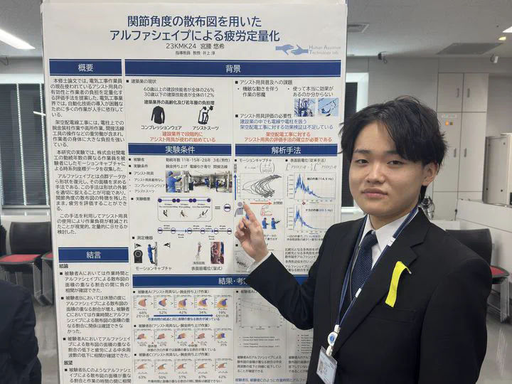 本論文では、電気工事作業におけるアシスト用具の効果や作業者負担を、モーションキャプチャで取得した動作データを用いて定量評価する手法を提案している。電気工事業界では自動化が難しく人力に依存する場面が多く、特に腕金装柱など高所での重労働が作業者の身体に大きな負担をかけている。本研究では勤続年数の異なる作業員の動作を計測し、その関節角度の分布をアルファシェイプで可視化・評価する手法を用いることで、アシスト用具使用の負荷軽減効果を定量的かつ視覚的に示すことを目指している。
